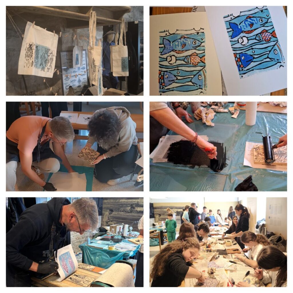 Uz klasično otiskivanje na papiru, ovogodišnja radionica donijela je i zanimljivu novost – otiskivanje na tekstilu, pa su učenici svoje radove prenijeli i na majice, platnene vrećice i pregače, stvarajući originalne uspomene na sudjelovanje u radionici.